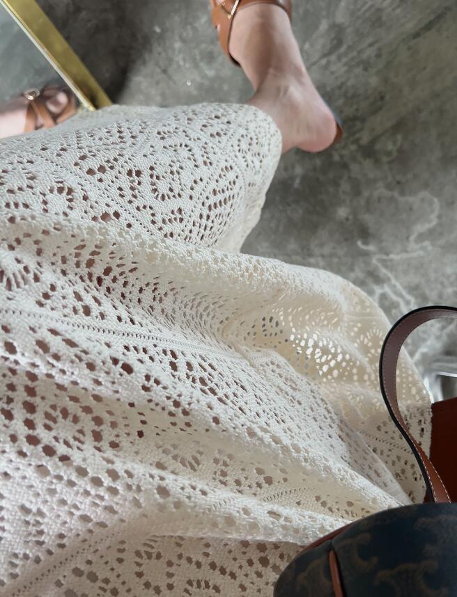 上品なレース風の編み柄がキレイめファッションを演出し、