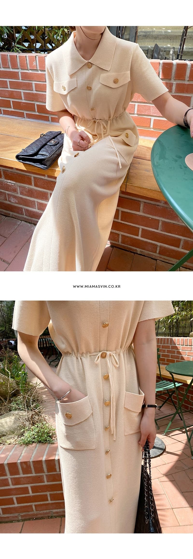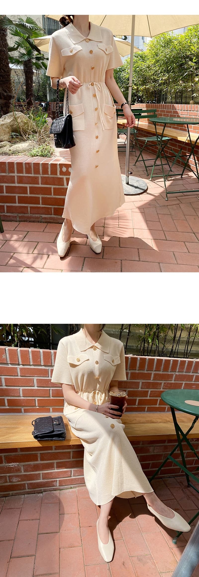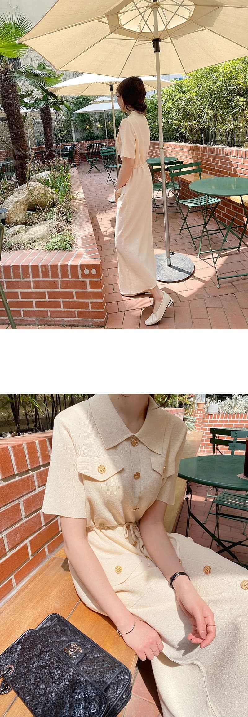 ウエストマークで美しいシルエットを演出し、胸ポケットやゴールドボタンなどのディテールが洗練された印象を与えます。