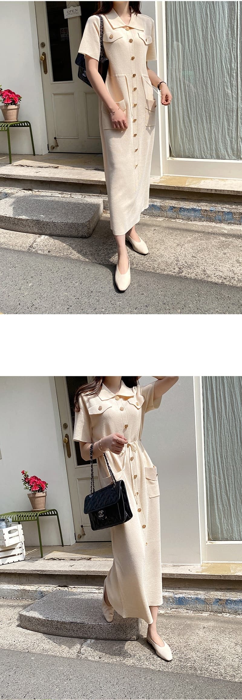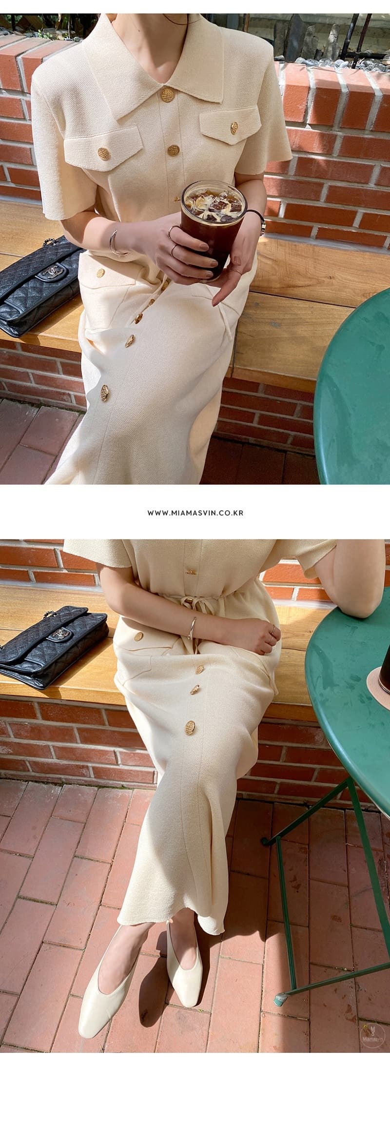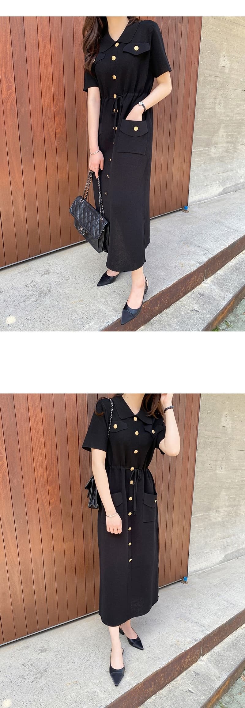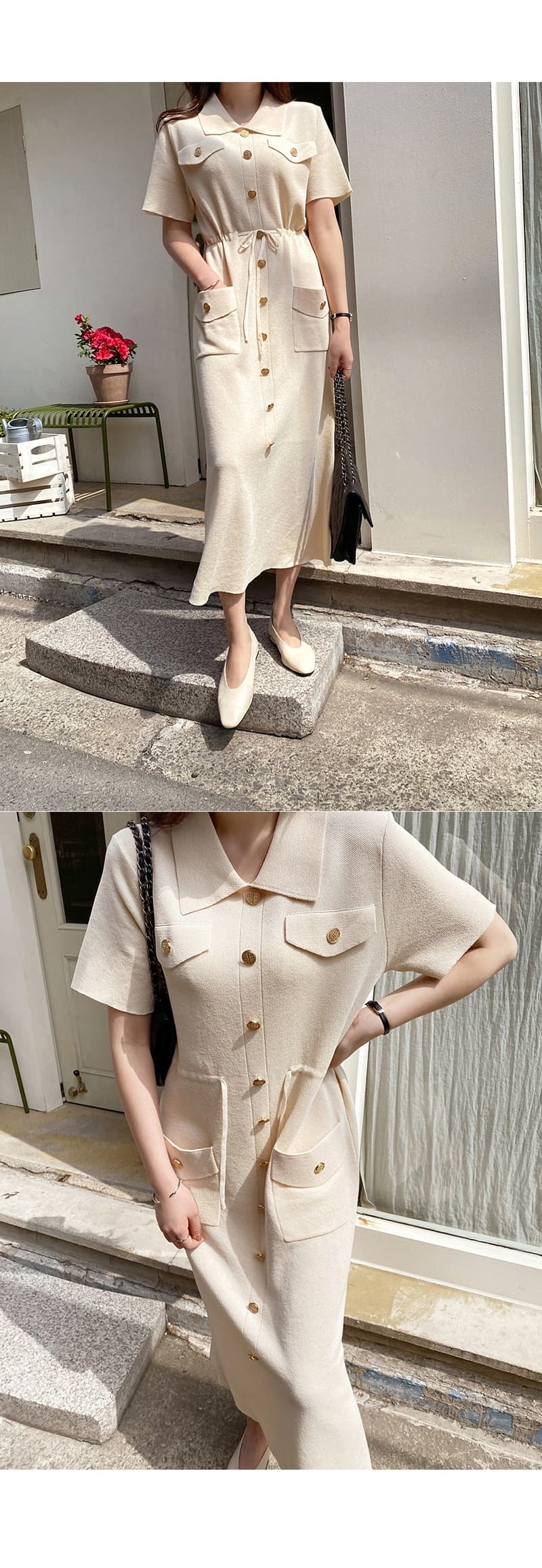 ウエストマークで美しいシルエットを演出し、胸ポケットやゴールドボタンなどのディテールが洗練された印象を与えます。